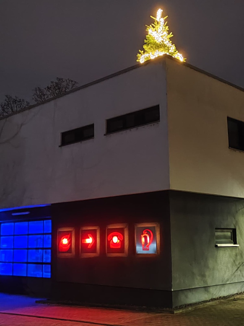 Durch die freundliche Spende des Weihnachtsmarktbaumes erstrahlt unser Gerätehaus weihnachtlich.